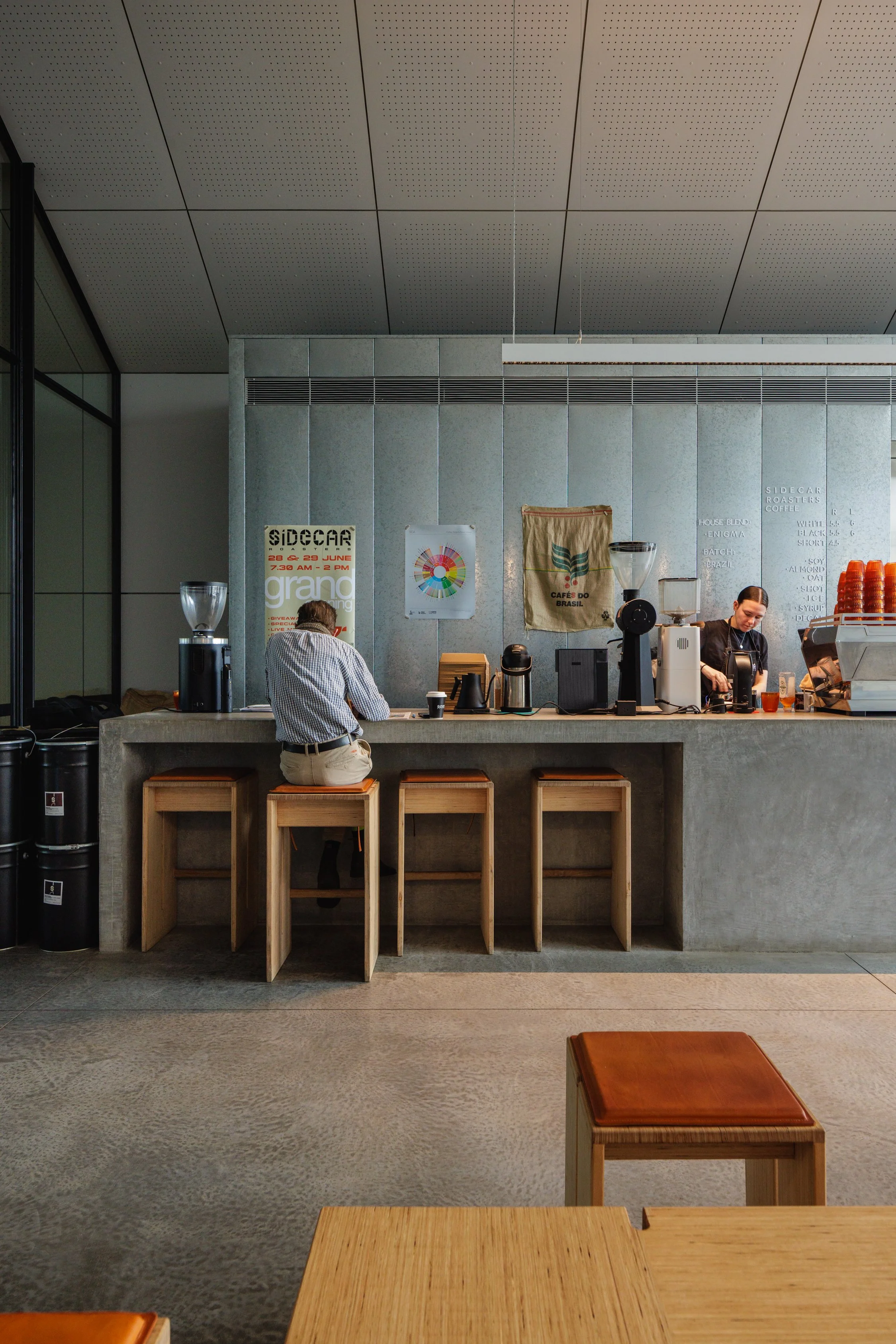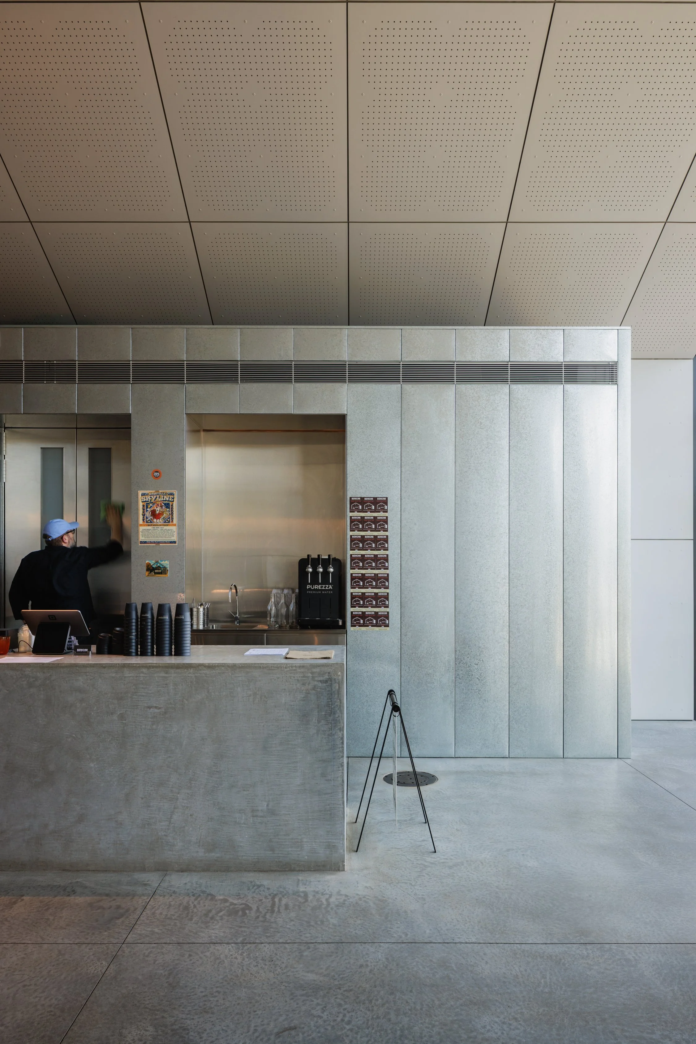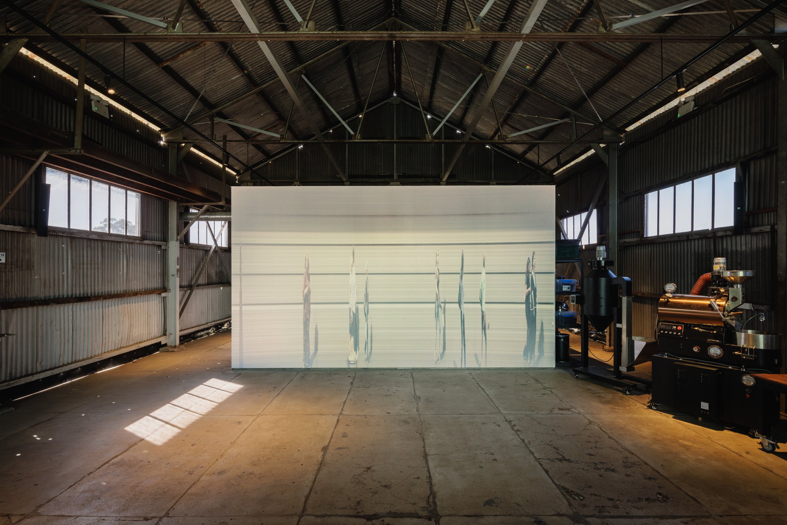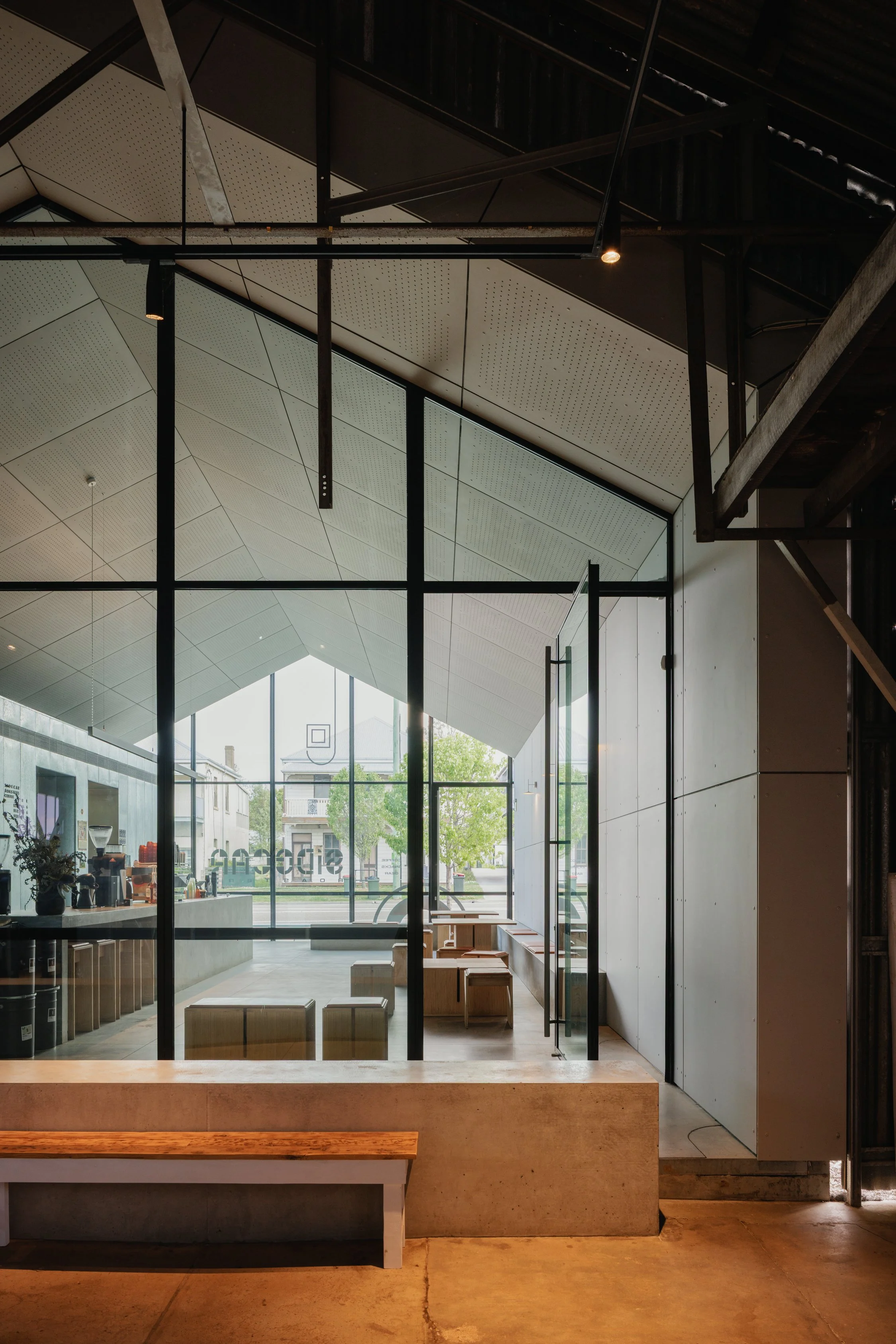 Telescoping out from a gallery space showing moving image projections by some of Australias most well-known artists, a café acts as oculus - framing and acting as a welcoming foreground. The dark and atmospheric space is clad in stark industrial materials and accompanied by low-lighting accents to provide a sense of drama, whilst allowing the moving image artworks to be viewed at museum-standard quality.